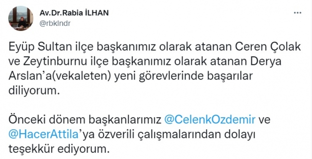 Eyüpsultan ak parti Kadın Kolları Başkanı olarak Ceren Çolak atandı.Bir süredir eski başkan Hacer Attila'nın görevden alındığı haberleri gündem olmuştu. Ak Parti İstanbul Kadın Kolları Başkanı Rabia İlhan eyüpsultan Kadın Kolları Başkanı olarak Ceren Çolak'ın atandığını sosyal medyadan duyurdu. Rabi İlhan sosyal medya hesabından yaptığı açıklamada,"Eyüp Sultan ilçe başkanımız olarak atanan Ceren Çolak ve Zeytinburnu ilçe başkanımız olarak atanan Derya Arslan’a(vekaleten) yeni görevlerinde başarılar diliyorum. Önceki dönem başkanlarımıza özverili çalışmalarından dolayı teşekkür ediyorum." ifadelerini kullandı.