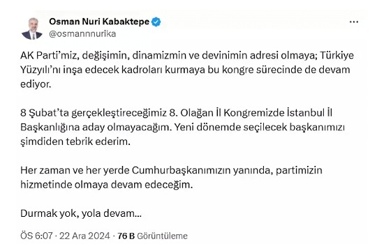 Kabaktepe, sosyal medya hesabından yaptığı açıklamada şu ifadelere yer verdi: " Ak Parti'miz, değişimin, dinamizmin ve devinimin adresi olmaya; Türkiye Yüzyılı'nı inşa edecek kadroları kurmaya bu kongre sürecinde de devam ediyor. 8 Şubat'ta gerçekleştireceğimiz 8. Olağan İl Kongremizde İstanbul İl Başkanlığına aday olmayacağım. Yeni dönemde seçilecek başkanımızı şimdiden tebrik ederim. Her zaman ve her yerde Cumhurbaşkanımızın yanında, partimizin hizmetinde olmaya devam edeceğim. Durmak yok, yola devam…"