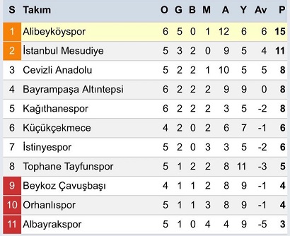 Bu sonuçla Alibeyköyspor 15 puanla zirvede tek başına kalırken Tophane Tayfunspor 5 puanda kalarak alt sıralardan uzaklaşamadı.