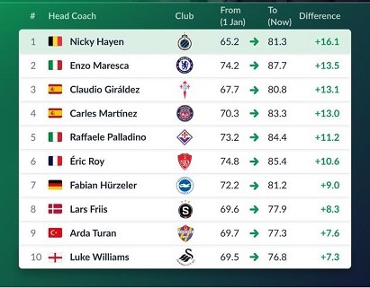 İşte TransferRoom'a göre 2024 yılının en fazla gelişim gösteren 10 teknik direktörü:
