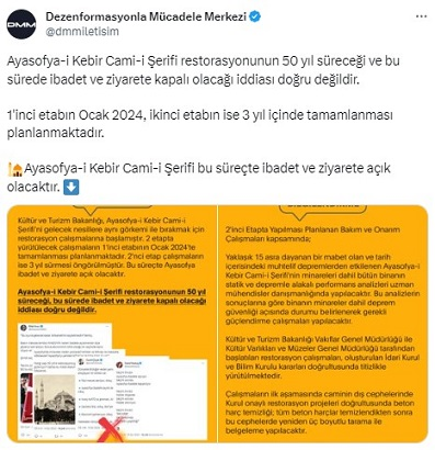 Ayasofya Camii'nin restorasyon nedeniyle 50 yıl ziyaret ve ibadete kapalı olacağı iddialarına Cumhurbaşkanlığı İletişim Başkanlığı Dezenformasyonla Mücadele Merkezi'nden yalanlama geldi.