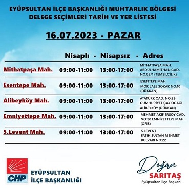 Pazar günü 5 mahallede delege seçimleri devam edecek. Delege seçimi Pazar günü saat 09.00’de başlayacak 17:00’de devam edecek. Seçimlerin yapılacağı Mithatpaşa, Esentepe, Alibeyköy, Emniyettepe, 5.Levent Mahallelerinde belirlenen adreslerde yapılması bekleniyor.