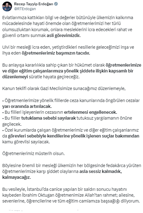 Erdoğan, eğitimcilere yönelik şiddete karşı uygulanacak ceza düzenlemesiyle ilgili ayrıntılara da yer verdiği sosyal medya paylaşımında şu ifadeleri kullandı: