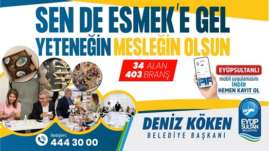 Eyüpsultan Belediyesi Sanat ve Meslek Eğitim Kurslarımızda yeni dönem kayıtları 21 Eylül Perşembe günü saat 10:00'da başlıyor. 10 merkezde 403 branşla vatandaşlara hizmet veren ve açıldığı günden bugüne kadar binlerce vatandaşı meslek sahibi yapan ESMEK'te yeni dönem heyecanı yaşanıyor.