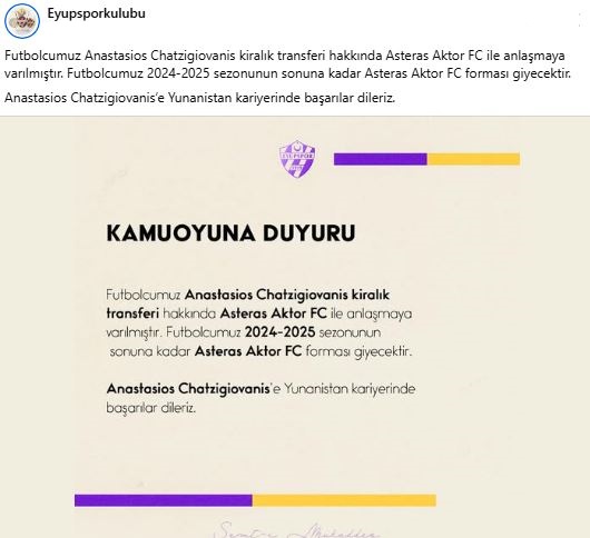 Trendyol Süper Lig ekiplerinden Eyüpspor, Anastasios Chatzigiovanis'in kiralık olarak Asteras Aktor FC'ye transfer olduğunu açıkladı. Kulüpten transfere ilişkin yapılan açıklamada, "Futbolcumuz Anastasios Chatzigiovanis kiralık transferi hakkında Asteras Aktor FC ile anlaşmaya varılmıştır. Futbolcumuz 2024-2025 sezonunun sonuna kadar Asteras Aktor FC forması giyecektir. Anastasios Chatzigiovanis’e Yunanistan kariyerinde başarılar dileriz." denildi.