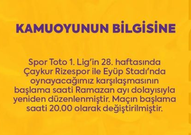 Eyüpspor, Çaykur Rizespor ligin 28. hafta maçında Eyüp stadında Pazar günü saat 19:00 oynanacak olan karşılaşma Ramazan ayı iftar saati nedeniyle saat 20:00 olarak düzenlendi.