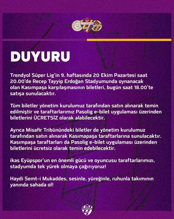 Eyüpspor, Trendyol Süper Lig'in 9. haftasında Kasımpaşa ile oynayacakları karşılaşmada biletlerin ücretsiz olacağını açıkladı.