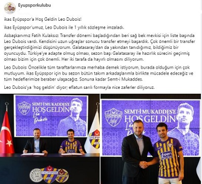 Eyüpspor, Galatasaray'dan ayrılan Fransız sağ bek Leo Dubois ile 1 yıllık sözleşme imzaladı. Eyüpspor Asbaşkanı Fatih Kulaksız, Dubois’in transferinin önemine dikkat çekti ve oyuncunun Türkiye'ye uyum sağlamış olmasının avantajını vurguladı.