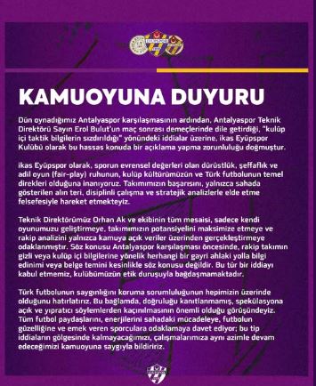 "Takımımızın başarısını, yalnızca sahada gösterilen alın teri, disiplinli çalışma ve stratejik analizlerle elde etme felsefesiyle hareket etmekteyiz. Teknik direktörümüz Orhan Ak ve ekibinin tüm mesaisi, sadece kendi oyunumuzu geliştirmeye, takımımızın potansiyelini maksimize etmeye ve rakip analizini yalnızca kamuya açık veriler üzerinden gerçekleştirmeye odaklanmıştır. Söz konusu Antalyaspor karşılaşması öncesinde, rakip takımın gizli veya kulüp içi bilgilerine yönelik herhangi bir gayriahlaki yolla bilgi edinimi veya belge temini kesinlikle söz konusu değildir. Bu tür bir iddiayı kabul etmemiz, kulübümüzün etik duruşuyla bağdaşmamaktadır."