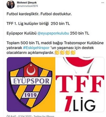 Eskişehirspor Kulübü Başkanı Mehmet Şimşek, sosyal medya hesaplarından dosya kapat kampanyasına, TFF 1'inci Lig Kulüpler Birliği ile Eyüpspor’un 250’şer bin lira destek olduğunu ifade ederek, “Futbol kardeşliktir. Futbol dostluktur. TFF 1'inci Lig Kulüpler Birliği 250 bin TL, Eyüpspor Kulübü 250 bin TL, toplam 500 bin TL maddi bağışı Trabzonspor Kulübü'ne yatırarak Eskişehirspor’un yaşaması için destek olacaklarını açıklamışlardır” dedi.