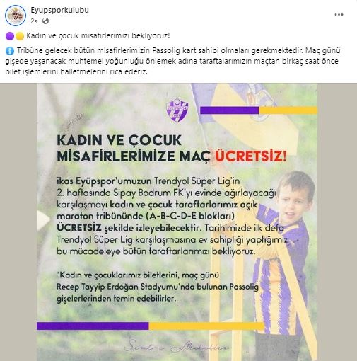 Eyüpspor'dan kadınlar ve çocuklara ücretsiz bilet