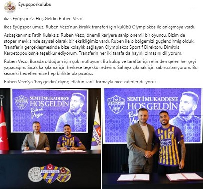 Eyüpspor, kadrosunu güçlendirmeye devam ediyor. İstanbul ekibi son olarak Olympiakos'tan Ruben Vezo'yu kadrosuna kattı.