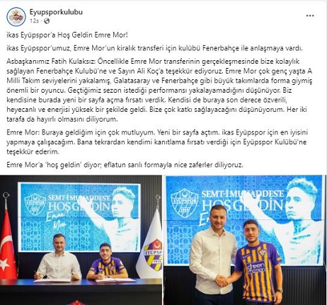Eyüpspor'a transferinden dolayı mutlu olduğunu dile getiren Emre Mor ise "Buraya geldiğim için çok mutluyum. Yeni bir sayfa açtım. Eyüpspor için en iyisini yapmaya çalışacağım. Bana tekrardan kendimi kanıtlama fırsatı verdiği için Eyüpspor Kulübü'ne teşekkür ederim" ifadelerini kullandı.