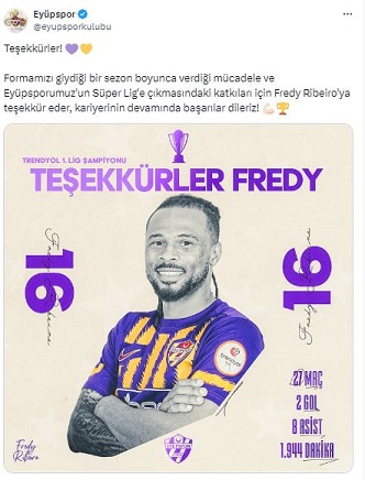 "Formamızı giydiği bir sezon boyunca verdiği mücadele ve Eyüpsporumuz'un Süper Lig'e çıkmasındaki katkıları için Fredy Ribeiro'ya teşekkür eder, kariyerinin devamında başarılar dileriz!"