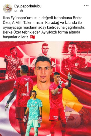 Eyüpspor "ikas Eyüpspor’umuzun değerli futbolcusu Berke Özer, A Milli Takımımız’ın Karadağ ve İzlanda ile oynayacağı maçların aday kadrosuna çağrılmıştır. Berke Özer tebrik eder, Ay-yıldızlı forma altında başarılar dileriz." dendi.