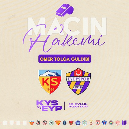 TFF Merkez Hakem Kurulu tarafından Süper Ligin 5’nci haftasında oynanacak olan müsabakalarda görev yapacak hakemler açıklandı. Eyüpspor’un Kayserispor ile karşılaşacağı müsabakayı Kocaeli bölgesi hakemi Ömer Tolga Güldibi yönetecek.