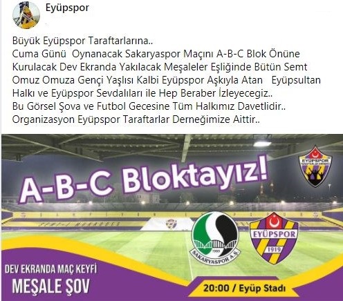 Cuma Günü Oynanacak Sakaryaspor Maçını A-B-C Blok Önüne Kurulacak Dev Ekranda Yakılacak Meşaleler Eşliğinde Bütün Semt Omuz Omuza Genci Yaşlısı Kalbi Eyüpspor Aşkıyla Atan Eyüpsultan Halkı ve Eyüpspor Sevdalıları ile Hep Beraber İzleyeceğiz.