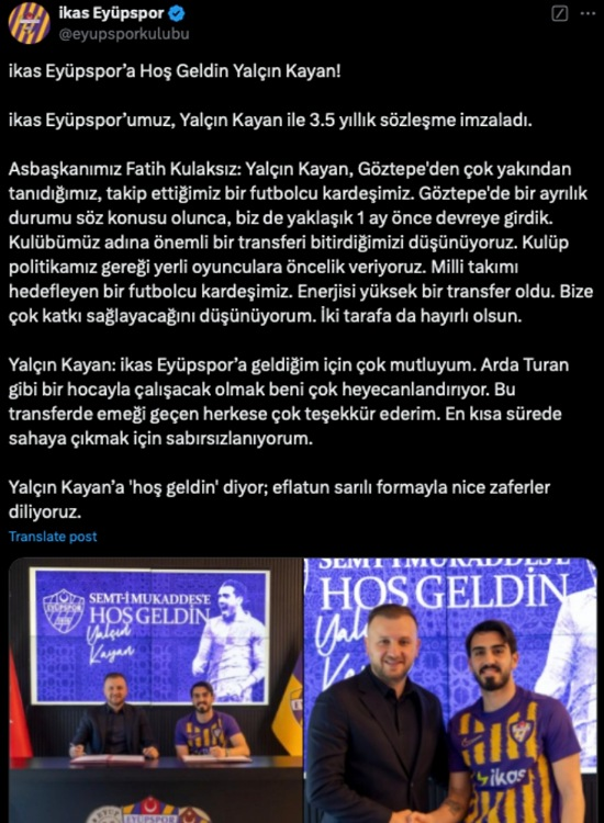 Eyüpspor, Göztepe'den Yalçın Kayan ile 3.5 yıllık bir anlaşma sağladı. Asbaşkan Fatih Kulaksız, transferin önemli olduğuna ve yerli oyunculara öncelik verdiklerine değindi. Yalçın Kayan ise Arda Turan ile çalışacak olmaktan mutluluk duyduğunu ifade etti.