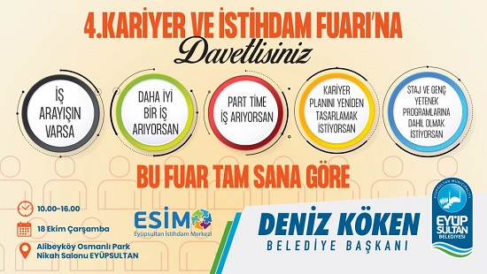 Eyüpsultan Belediye Başkanı Deniz Köken’in, “5 yılda 5 bin istihdam” sözüyle, birçok kişiyi işe yerleştiren, iş veren ve iş arayan arasında köprü vazifesi gören Eyüpsultan Belediyesi, bu yıl Kariyer ve İstihdam Fuarı’nın 4.’sünü düzenliyor.