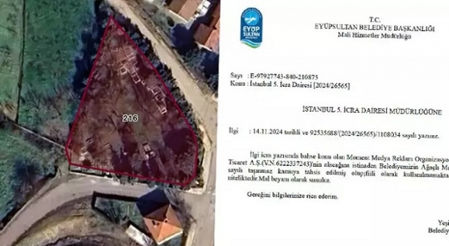 Yasal süreç çerçevesinde Eyüpsultan Belediyesi'nin mal beyanında bulunması istenildi. Eyüpsultan Belediyesi'nden alacaklı şirket sahibi Yılmaz Kurt'a borca karşılık 'Ağaçlık Mahallesi 216 parsel sayılı taşınmaz' gösterilerek, icraya verip satışının yapılabileceği söylendi.