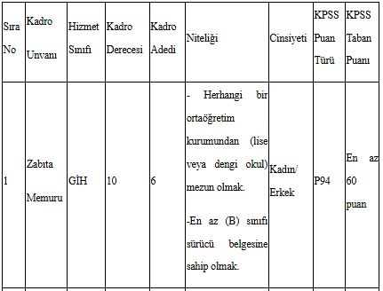 Eyüpsultan Belediye Başkanlığı bünyesinde 657 sayılı Devlet Memurları Kanununa tabi olarak istihdam edilmek üzere, Belediye Zabıta Yönetmeliği hükümlerine göre aşağıda unvanı, sınıfı, derecesi, adedi, nitelikleri, KPSS türü, KPSS taban puanı ve diğer şartları taşımak kaydı ile belirtilen boş kadrolara açıktan atama yoluyla Zabıta Memuru alınacaktır.