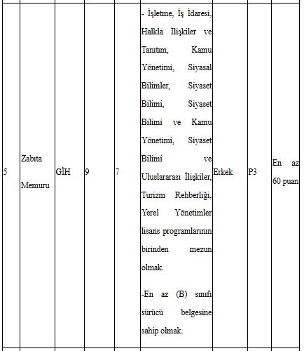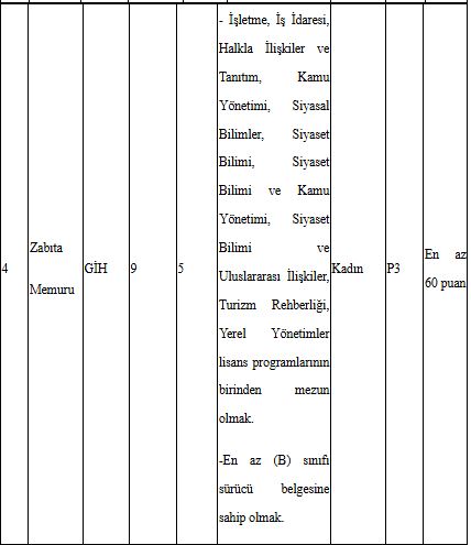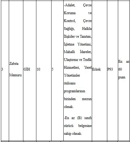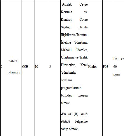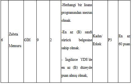 657 sayılı Devlet Memurları Kanununun 48 inci maddesinin (A) fıkrasında belirtilen genel şartların yanı sıra Belediye Zabıta Yönetmeliğinin 13/A maddesinde yer alan özel şartlara göre, zabıta memuru kadrolarına başvuru yapılabilmesi için; tartılma ve ölçülme aç karnına, soyunuk ve çıplak ayakla olmak kaydıyla erkeklerde en az 1.67 metre, kadınlarda en az 1.60 metre boyunda olmak ve boyun 1 metreden fazla olan kısmı ile kilosu arasında (+,-) 10 kg’dan fazla fark olmamak. Belediyemizce başvuru evrakları teslim alınmadan önce sağlık personeli gözetiminde boy ve kilo ölçümü yapılacaktır.