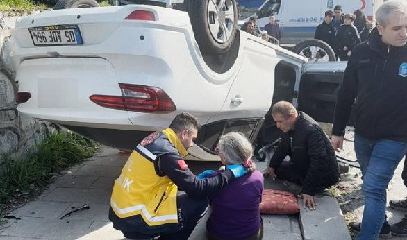 Edinilen bilgiye göre, 05 AFD 964 plakalı araç, sürücüsünün kontrolünden çıkarak önce park halindeki otomobile sonra da kaldırıma çıkarak bir süre ilerleyip devrildi. Araçta sıkışan sürücü ile yanındaki eşine vatandaşlar yardıma koştu.