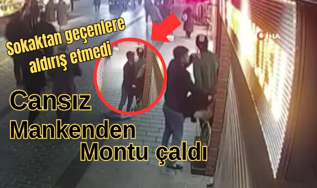 Güvenlik kamerası görüntülerinde, hırsızın mağazanın önüne geldiği ve mankenin üzerindeki montu çıkararak olay yerinden hızla uzaklaştığı görülüyor.