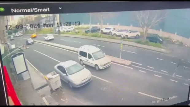 Kaza anı bölgedeki bir iş yerinin güvenlik kamerası tarafından kaydedildi. Görüntülerde, sola dönüş yapan otomobile karşı yönden gelen hafif ticari aracın çarpması ve iki aracın savrularak park halindeki otomobile çarptığı anlar yer alıyor.