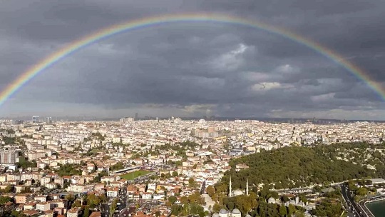 İstanbul'da sabah saatlerinde yağmur sonrası gün doğumunda oluşan gökkuşağı Eyüpsultan semalarında görüntülendi.