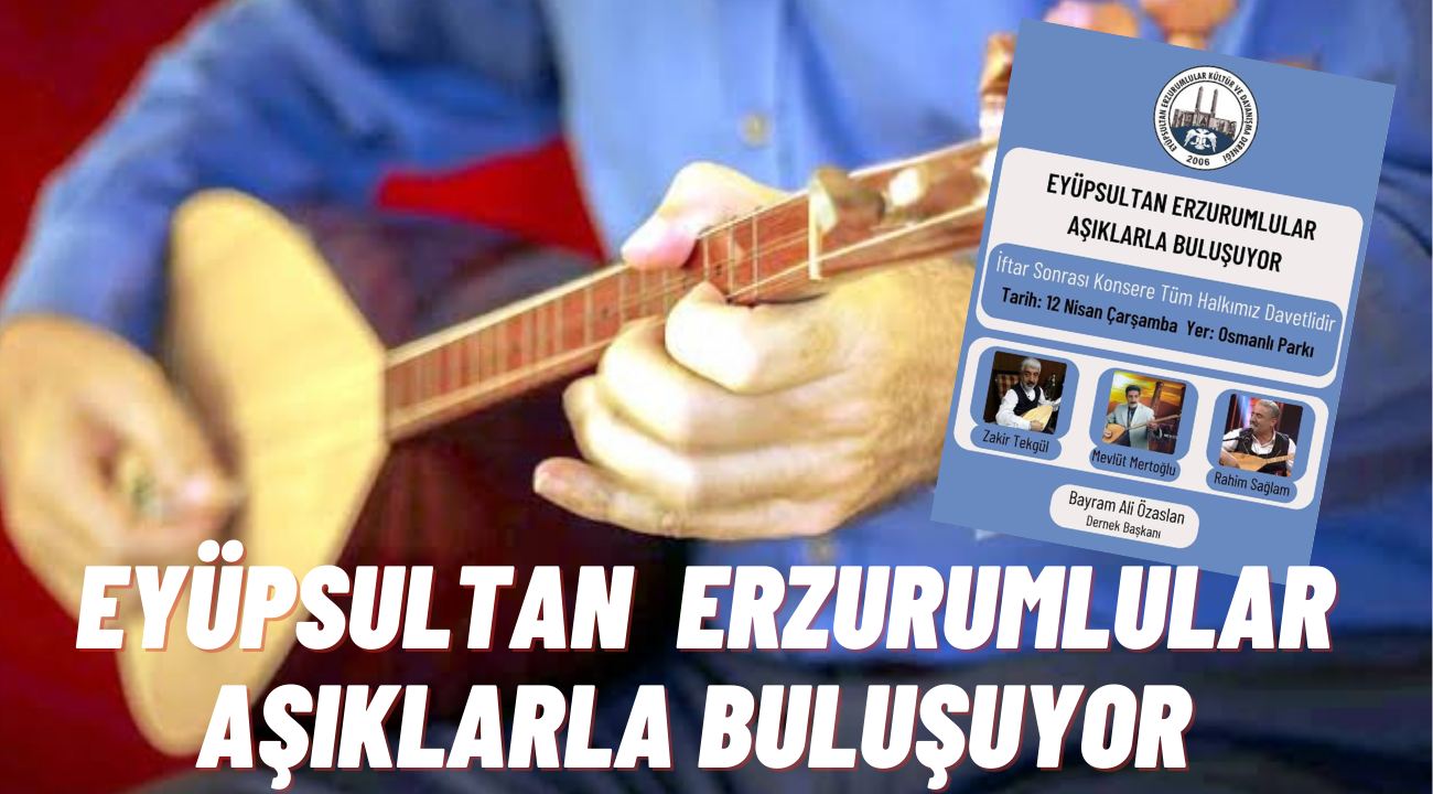 Eyüpsultan Erzurumlular Derneği Aşıklarla buluşacak.Alibeyköy de bulunan Osmanlı Park 'ta yapılacak konserde ünlü halk ozanları sahne alacak.Dernek Başkanı Bayram Ali Özaslan'ın sosyal medya hesabından yaptığı paylaşımda 12 Nisan 2023 Çarşamba (yarın) iftrın akabinde Aşıklar Konseri düzenlenecek.Eyüpsultan Erzurumlular Dernek Başkanı Bayram Ali Özaslan tüm hemşehrilerimiz ve vatandaşlarımızı konsere davet etti.Eyüpsultan Belediyesi Alibeyköy, Osmanlı Park’ta yapılacak konserde, Zakir Tekgül, Mevlüt Mertoğlu ve Rahim Sağlam gibi halk müziğinin usta sazları sahne alacak.