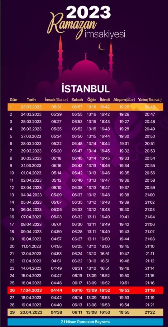 İstanbul Avrupa yakasında yer alan Eyüpsultan, Fatih, Eyüp, Gaziosmanpaşa ilçeleri için Ramazan imsakiyesi yayımlandı. Buna göre 23 Mart Perşembe günü iftar (akşam ezanı) saat 19.25’te yapılacak.