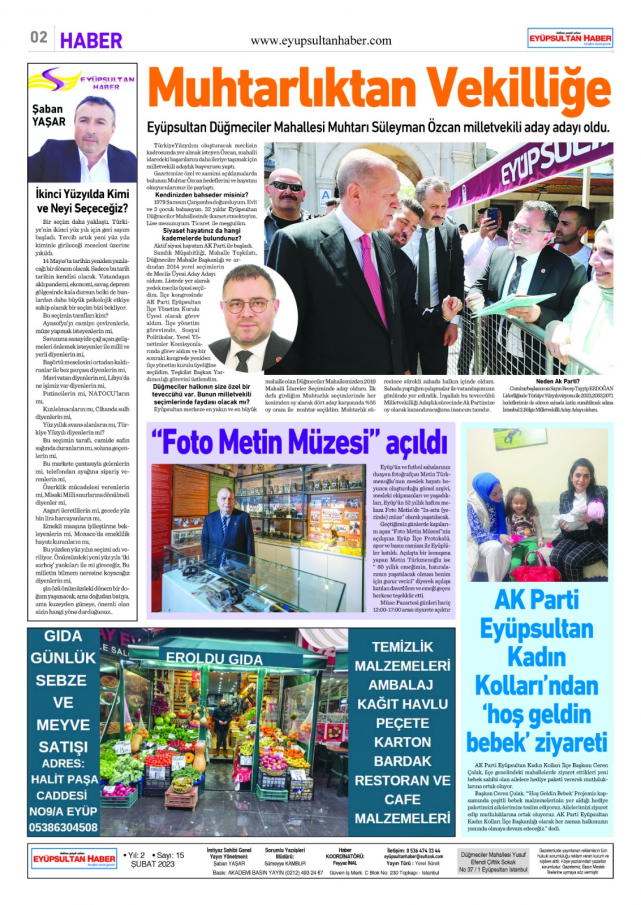 EYÜPSULTAN 25 Mart 2023 - 13:47 Eyüpsultan Haber Gazetesi yeni sayısı çıktı Eyüpsultan Haber yeni sayısı okuyucularıyla buluştu. EYÜPSULTAN 25 Mart 2023 - 13:47 Yorumlar 1 dk okunma süresi Dinle A Büyüt A Küçült Yorumlar Eyüpsultan Haber Gazetesi 16. sayı HABER23458 EDİTÖR Eyüpsultan Haber YORUMLAR adlı kullanıcıya cevap x Gönder İlginizi Çekebilir Eyüpsultan'da 2 aracı kurşunlayan 3 şüpheli tutuklandı Eyüpsultan CHP Grup Başkan Vekili Ali Öztürk gazeteciler ile buluştu Eyüpsultan Göktürk'te çamura saplanan çocuk kurtarıldı Eyüpsultan’da dolu etkili oldu: Fındık büyüklüğünde yağdı Son Haberler OKULLARDA GÜVENLİK VE EĞİTİM SİSTEMİ ÜZERİNE KARARLI BİR ÇAĞRI Alibeyköyspor’un play-off yolu netleşti, kura çekildi Eyüpsultan'da 2 aracı kurşunlayan 3 şüpheli tutuklandı Eyüpsultan’da “Zarafet Engel Tanımaz” etkinliği düzenlendi İstanbul’da mezarlıklar için kamera kararı alındı