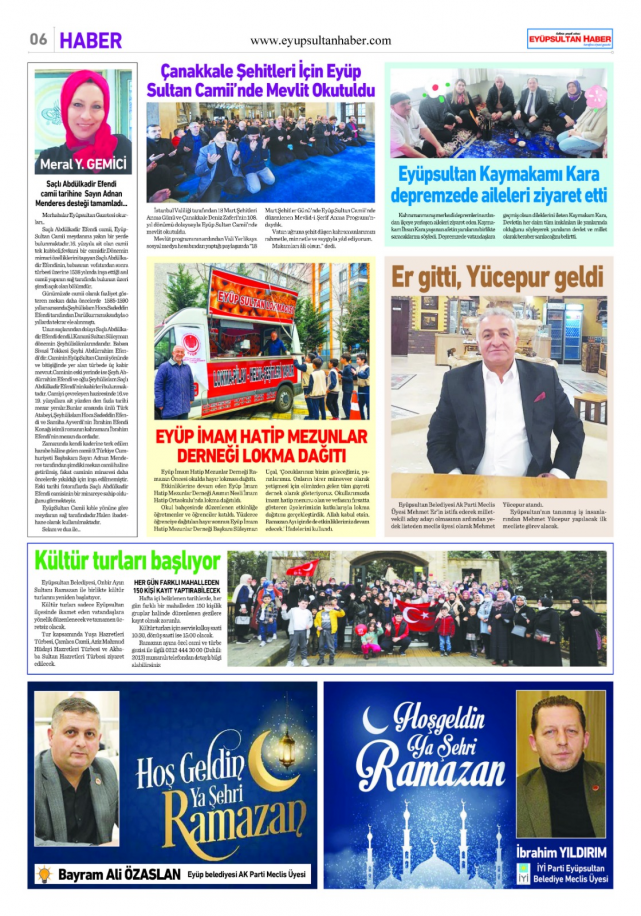 EYÜPSULTAN 25 Mart 2023 - 13:47 Eyüpsultan Haber Gazetesi yeni sayısı çıktı Eyüpsultan Haber yeni sayısı okuyucularıyla buluştu. EYÜPSULTAN 25 Mart 2023 - 13:47 Yorumlar 1 dk okunma süresi Dinle A Büyüt A Küçült Yorumlar Eyüpsultan Haber Gazetesi 16. sayı HABER56789 EDİTÖR Eyüpsultan Haber YORUMLAR adlı kullanıcıya cevap x Gönder İlginizi Çekebilir Eyüpsultan'da 2 aracı kurşunlayan 3 şüpheli tutuklandı Eyüpsultan CHP Grup Başkan Vekili Ali Öztürk gazeteciler ile buluştu Eyüpsultan Göktürk'te çamura saplanan çocuk kurtarıldı Eyüpsultan’da dolu etkili oldu: Fındık büyüklüğünde yağdı Son Haberler OKULLARDA GÜVENLİK VE EĞİTİM SİSTEMİ ÜZERİNE KARARLI BİR ÇAĞRI Alibeyköyspor’un play-off yolu netleşti, kura çekildi Eyüpsultan'da 2 aracı kurşunlayan 3 şüpheli tutuklandı Eyüpsultan’da “Zarafet Engel Tanımaz” etkinliği düzenlendi İstanbul’da mezarlıklar için kamera kararı alındı
