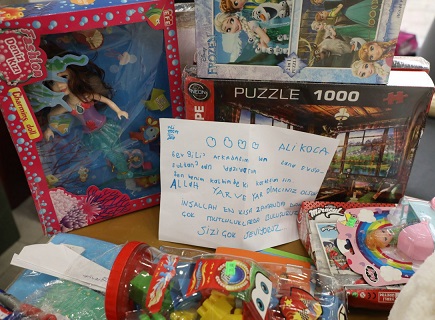“Merhaba kardeşim benim adım İsmet Yaşar. Ben İstanbul’da yaşıyorum ve Malatyalıyım. Malatya’da Deprem olduğu için çok üzülüyorum. Ben üzüldüğünü de biliyorum. Bu oyuncakları sana gönderiyorum” şeklinde notlar ve mektuplar yazdılar. Miniklerin gönüllerinden geldiği gibi yazdıkları mektup ve notlar görenleri duygulandırdı.