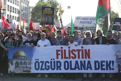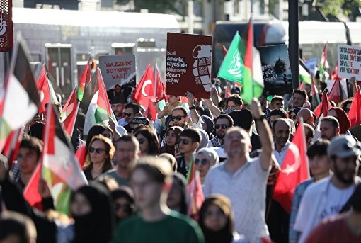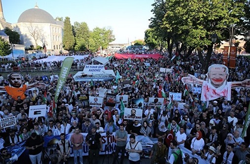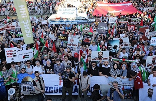 Katılımcılar, 31 Mayıs 2010'da İsrail'in Mavi Marmara gemisine uluslararası sularda yaptığı saldırıda şehit olan isimlerin anıldığı pankartlar da taşıdı.