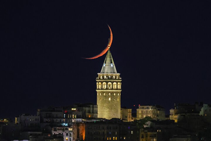 İstanbul'da hilal, Galata Kulesi ile birlikte güzel görüntü oluşturdu.
