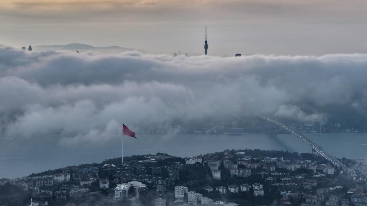 Şehrin büyük bölümü bulutların altında kalırken, Çamlıca Kulesi ile birlikte gün doğumu manzarası eşsiz görüntüler ortaya çıkarttı.
