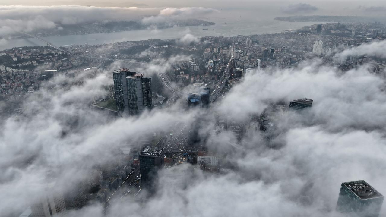 Modern mimarisiyle öne çıkan finans merkezinin kuleleri, bulutların arasından kısmen görünerek etkileyici bir atmosfer oluşturdu. Sisle bütünleşen yapılar, kentin masalsı karelerle yansıttı.