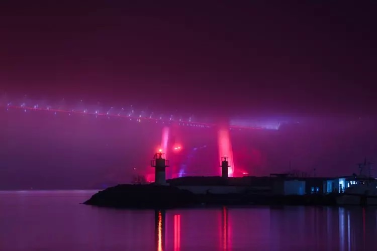 Sis ile köprülerin ışıklandırmaları birleşince masalsı görüntüler oluştu.