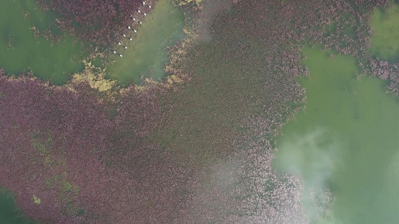 Arnavutköy'deki Terkos Gölü'nde yeşil bitkilerin sonbaharla birlikte renk değiştirmesi görsel şölen oluşturdu. Göldeki manzara havadan görüntülendi.