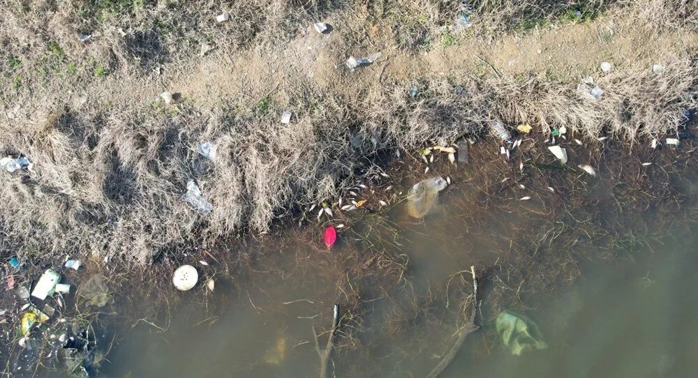 Atık suyun fabrikaların bulunduğu noktadan akarak göle aktarılması drone ile havadan görüntülendi.