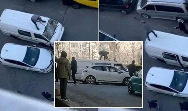 Minibüs şoförü diğer aracın camlarını kırarken otomobil sahibi de minibüsün üzerine çıkarak elindeki balyoz ile camları kırdı.