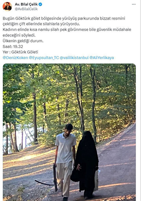 Çelik'in dün sosyal medya hesabından, Göktürk gölet bölgesinde yürüyüş parkurunda yürüyen bir çiftin izinsiz çekilen fotoğraflarını paylaşarak 'ellerinde silah taşıdıklarını' iddia etti.