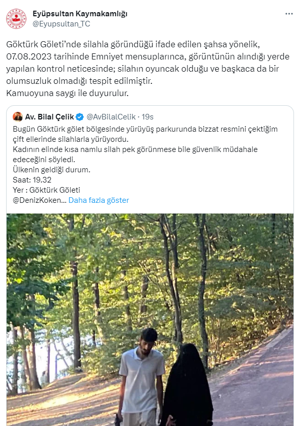 DEVA Partisi Sarıyer İlçe Başkanı Bilal Çelik sosyal medya hesabından, Göktürk gölet bölgesinde yürüyüş parkurunda yürüyen bir çifti paylaşarak ellerinde 'silah' taşıdıklarını iddia etti. Ancak gerçek çok geçmeden ortaya çıktı. Eyüpsultan Kaymakamlığı konuyla ilgili yaptığı açıklamada çiftin elindeki silahın oyuncak olduğunu belirtti. DEVA Partisi Sarıyer İlçe Başkanı Bilal Çelik sosyal medyadaki dezenformasyona bir yenisi daha ekledi.