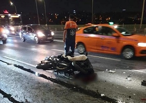 Haliç Köprüsü'nde seyir halindeki motosiklet İBB'ye ait yol temizleme aracına arkadan çarptı. Kazada motosiklet sürücüsü olay yerinde hayatını kaybetti.