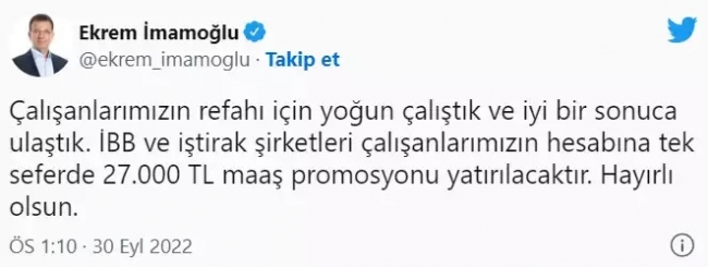 "Çalışanlarımızın refahı için yoğun çalıştık ve iyi bir sonuca ulaştık. İBB ve iştirak şirketleri çalışanlarımızın hesabına tek seferde 27.000 TL maaş promosyonu yatırılacaktır. Hayırlı olsun."