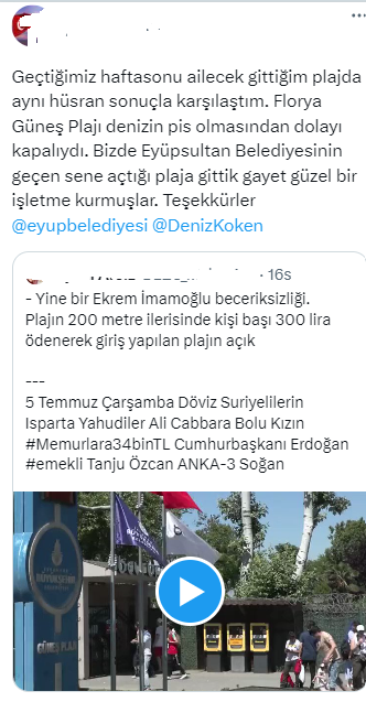 İBB’nin skandalları devam ediyor. İstanbul’un sahillerinde halkın denize girmesi için alan oluşturamayan CHP’Li İmamoğlu var olan plajları da kapatmaya başladı. Son olarak Yeşilköy’de bulunan İBB’ye bağlı halk plajı kirlilik nedeniyle kapatıldı. İBB paljının 200 metre ilerisinde bulunan özel plaj ise himet vermeye devam ediyor. Zamanında gerekli tedbirleri almayan İBB yönetimi sezon başlamasıyla İstanbul halkını denize girmekten mahrum etti. İstanbullu vatandaşlar Ak Parti İlçe Belediyelerinin hizmete aldığı temiz ve güvenilir plajlara akın etti. Eyüpsultan Belediyesi’nin geçen yıl hizmete aldığı Çiftalan Plajı vatandaşların sıcak havalarda serinlemesi için vazgeçilmez mekanlardan birisi oldu. İBB’ye bağlı Florya plajına gidemeyen vatandaş soluğu Eyüpsultan Belediyesi Çiftalan Plajı’nda aldı. Aradıkları temizlikte ve rahatlıkta deniz keyfi çıkaran vatandaşlar sosyal medyadan Başkan Deniz Köken ve Eyüpsultan Belediyesi’ne teşekkür etti. Bir vatandaş sosyal medya hesabından yaptığı paylaşımda, ‘Geçtiğimiz haftasonu ailecek gittiğim plajda aynı hüsran sonuçla karşılaştım. Florya Güneş Plajı denizin pis olmasından dolayı kapalıydı. Bizde Eyüpsultan Belediyesinin geçen sene açtığı plaja gittik gayet güzel bir işletme kurmuşlar. Teşekkürler @eyupbelediyesi @DenizKoken’ ifadelerini kullandı.