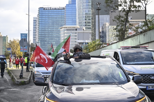 İnsan Hak ve Hürriyetleri (İHH) İnsani Yardım Vakfı ekiplerinden oluşan 66 akredite arama kurtarma ekibi, motosikletleri ve araçlarıyla Yenikapı Etkinlik Alanı'nda bir araya geldi. Filistin ve Türk bayraklarıyla süslenmiş araçlarla konvoya katılan sürücüler, Filistin'e destek sloganları eşliğinde araçlarıyla İsrail'in İstanbul Başkonsolosluğu önüne hareket etti.