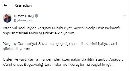 Adalet Bakanı Yılmaz Tunç'tan saldırıya ilişkin paylaşım geldi. Tunç, "İstanbul Kadıköy’de Yargıtay Cumhuriyet Savcısı Necip Cem İşçimen’e yapılan fiziksel saldırıyı şiddetle kınıyorum" ifadelerini kullandı